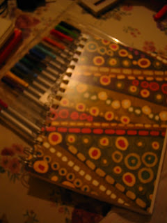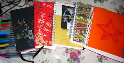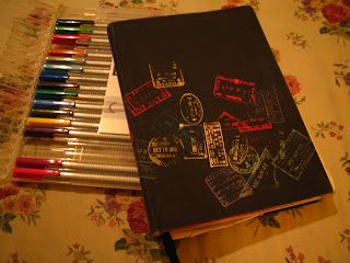 My current favorite is the one my sister got for me during her trip to the States--it has different colored blank pages, perfect for writing, doodling, ranting and the occasional impulse to sketch an object, person or scene I suddenly find fascinating. I love the cover--different colored passport stamps set against a black canvass binding.